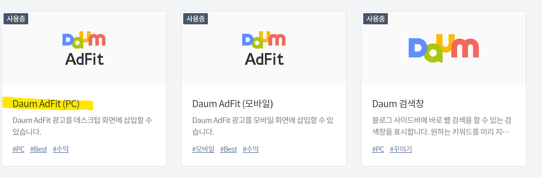 플로그인에 들어가시면 이렇게 다음 애드핏이 뜹니다. 그럼 pc로 들어가시면 됩니다.